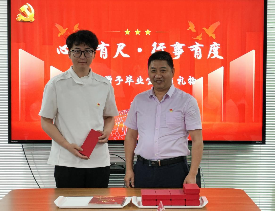 最后,经理周旭辉为毕业生党员发放公司精心准备的纪念品。纪念品是一把特制铜尺,上面刻着“心中有尺,行事有度”,提醒党员时刻严守党纪国法,坚守道德底线,希望大家在工作中秉持科学态度,为生态文明建设贡献力量。公司党委委员王晓春教授为大家赠送纪念册,纪念册帮助毕业生党员清晰掌握离校后的组织生活规范,在复杂多变的环境中始终牢记党员身份,以实际行动践行初心使命。