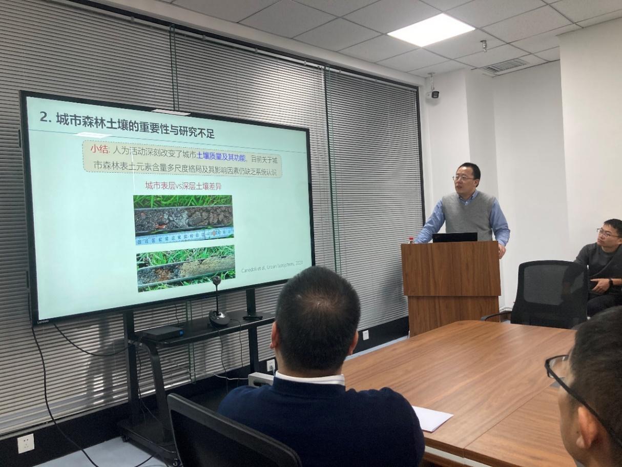 杜恩在教授带来了题为“城市森林土壤元素含量的多尺度格局”的精彩报告。杜恩在教授首先分析了大气元素沉降的城市热点效应,发现酸性离子和微量金属元素的沉降存在城市热点现象,其浓度和通量随城市距离越近呈增加趋势,反映出人类活动深刻改变了区域元素循环格局。随后指出人为活动深刻改变了城市土壤质量及其功能,但目前关于城市森林表土元素含量多尺度格局及其影响因素仍缺乏系统认识。最后基于局地尺度、区域尺度和全球尺度,深入研究了土壤碳组分格局变化,强调了人为因素对局地尺度土壤元素格局有重要影响,而气候因素对区域和全球尺度元素格局有重要影响。