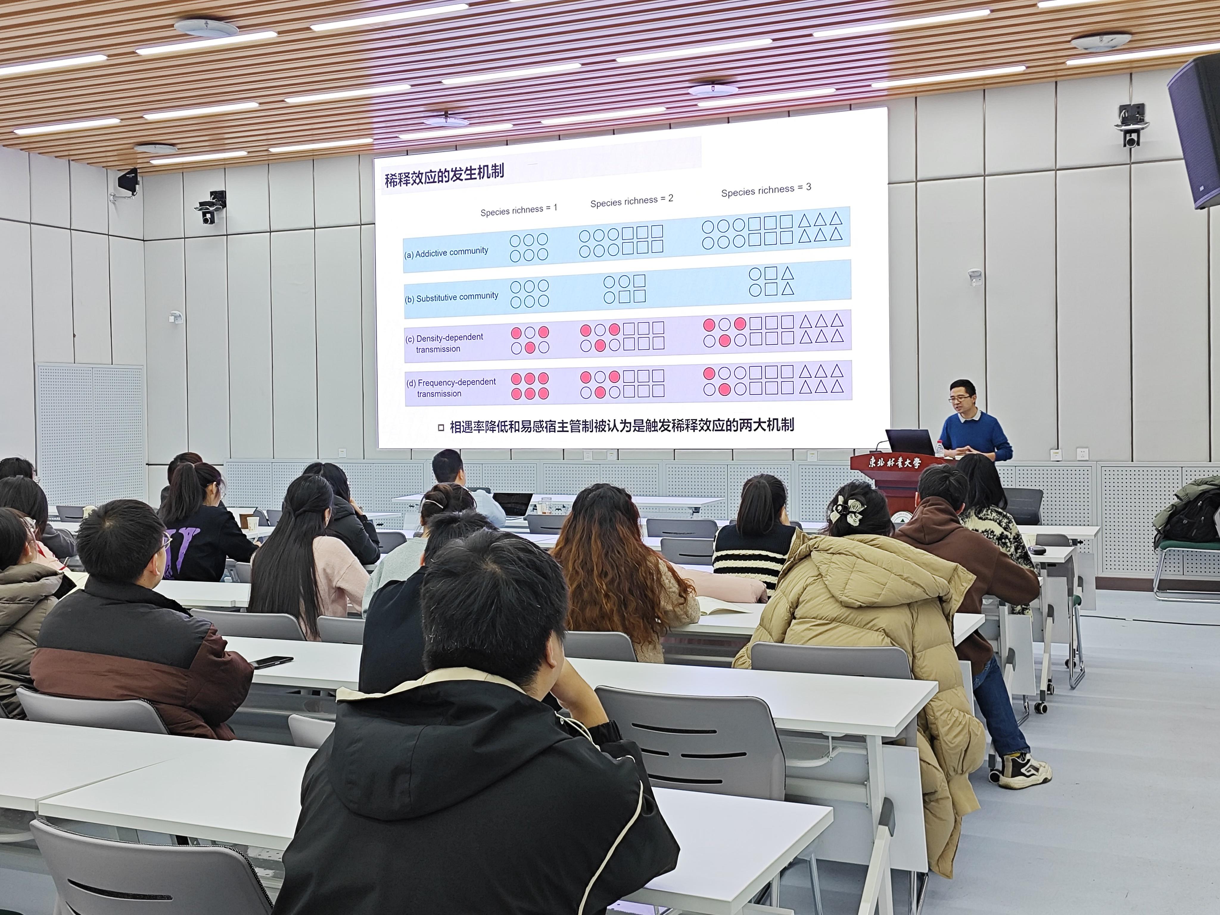 刘向教授带来了题为“天然草地生态系统中的植物病害及预测”的精彩学术报告。刘向教授首先分析了植物多样性对植物病害的稀释效应,其中活体营养型病原菌表现出较强的稀释效应。随后分析放牧对不同生活史类型植物病害的影响,指出不同的营养型病原菌表现出相反的结果。最后论述了菌根真菌对不同生活史类型植物病害的影响,并揭示了其影响机制。