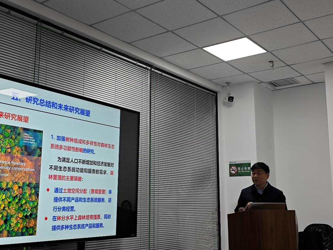 随后,项教授为同学们做“亚热带树种多样性对森林生产力与稳定性调控机制”的报告。他针对当下“生物多样性与生态系统功能之间的关系(BEF)”的热点问题,首先介绍了生物多样性与生态系统功能关系的一般结论及不确定性,提出了超产假设、养分循环和保险假设等理论,并聚焦于亚热带树种多样性对森林生产力与稳定性的调控机制,提出了一系列创新性的科学问题和数据分析方法,随后他介绍了树种多样性与生产力关系以及生产力稳定性的作用机理,最后,他提出未来要加强树种组成和多样性对森林生态系统多功能性影响的研究以及加强生物多样性对地下生态过程影响及调控机制的研究。报告结束后,各位老师和同学们踊跃提问,项教授对大家提出的问题进行耐心的解答。