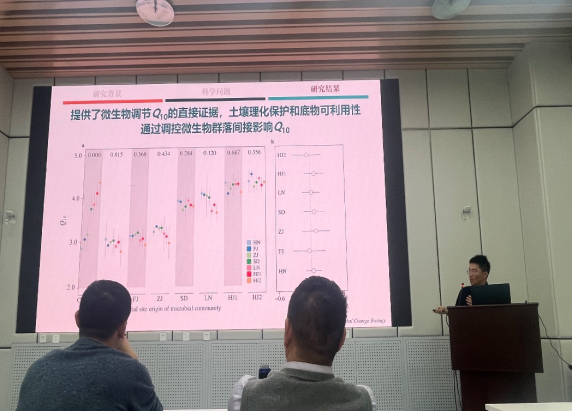 随后,李老师为同学们做“土壤碳-气候反馈的地理格局与调控机制”的报告。他提出了三个核心科学问题:“土壤碳分解温度敏感性的一般地理格局是什么”、“土壤碳分解温度敏感性地理变异的调控机制是什么”以及“土壤碳分解温度敏感性的地理变异如何改善土壤碳-气候反馈预测”。李老师在报告中详细讲解了这些问题,并分享了他在土壤碳分解温度敏感性领域的最新研究成果。报告结束后,李老师与现场的老师和同学们展开了积极的互动,并耐心解答了大家的提问。