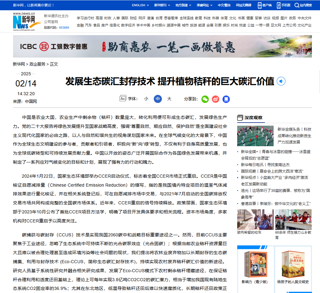 2月14日,新华网以《发展生态碳汇封存技术 提升植物秸秆的巨大碳汇价值》为题,报道公司何念鹏团队科技成果。