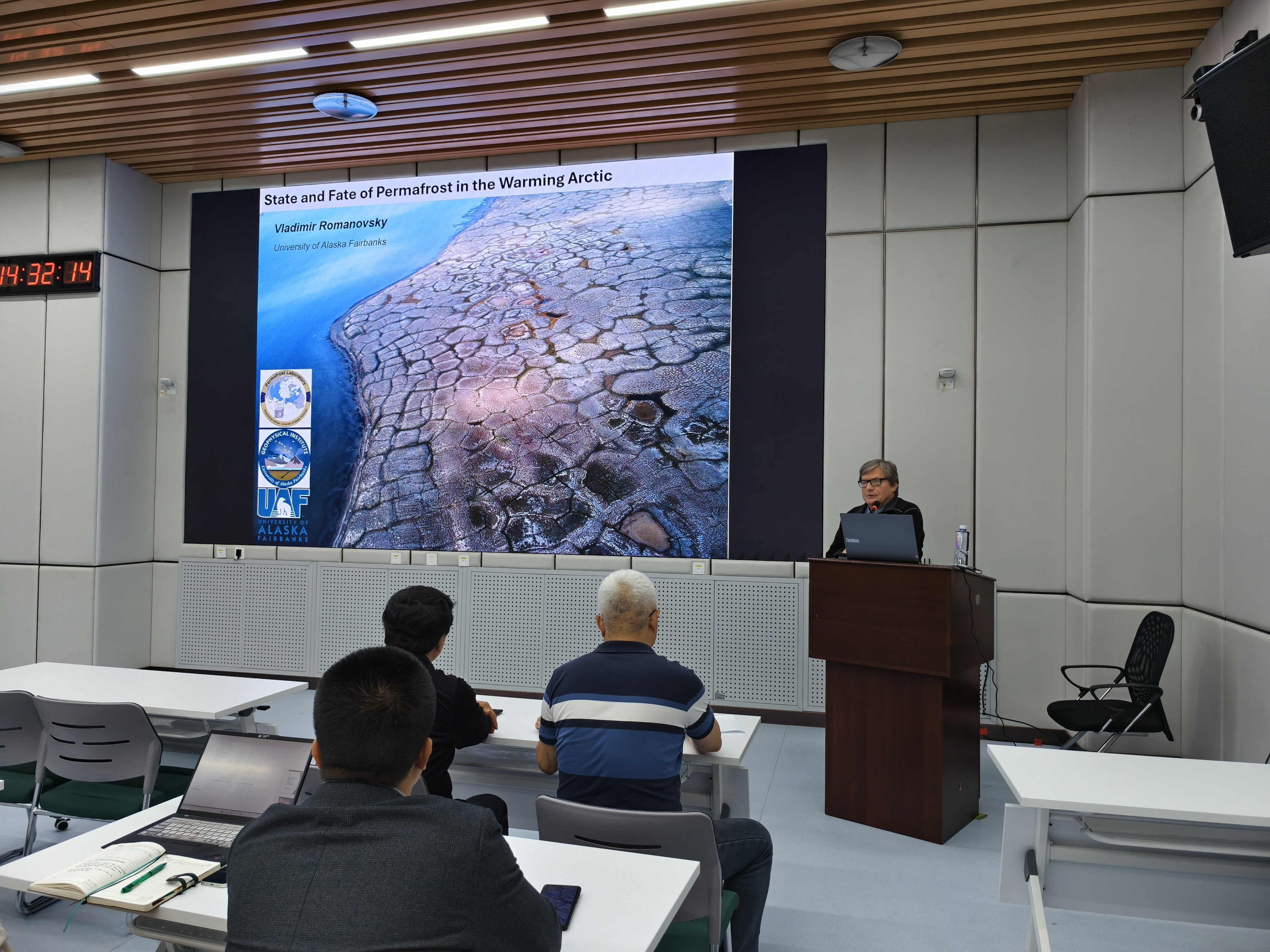 Romanovsky教授以北极多年冻土为研究核心,结合其团队超过40年在北美及俄罗斯北极和亚北极地区的监测数据,揭示了气候变暖对冻土环境的深刻影响。他指出,多年冻土作为寒冷气候的产物,广泛分布于高纬度和高海拔地区,而近期的气候变暖已打破其“稳定状态”,突出表现为冻土温度上升与热稳定性下降。